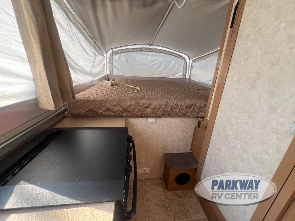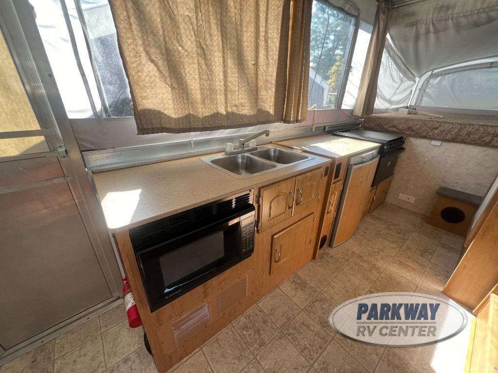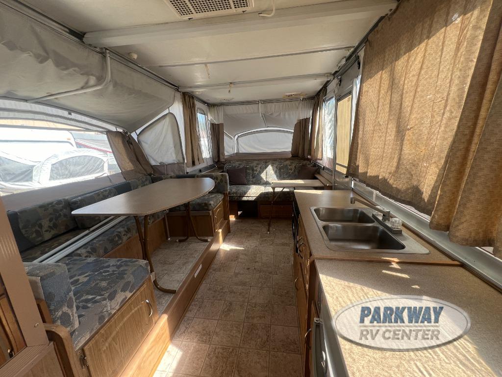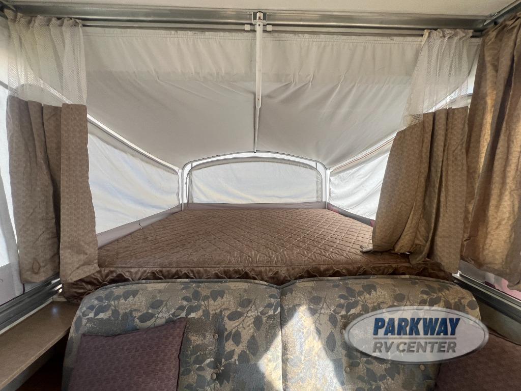 Two King Tent End Beds, Solid Walled Bathroom w/Shower & Flushable Commode, Slideout Portable Dinette Table, Sofa Bed, Flip-Up Table, Double Kitchen Sink, 3 Burner Range, Outdoor RVQ Grill and More.