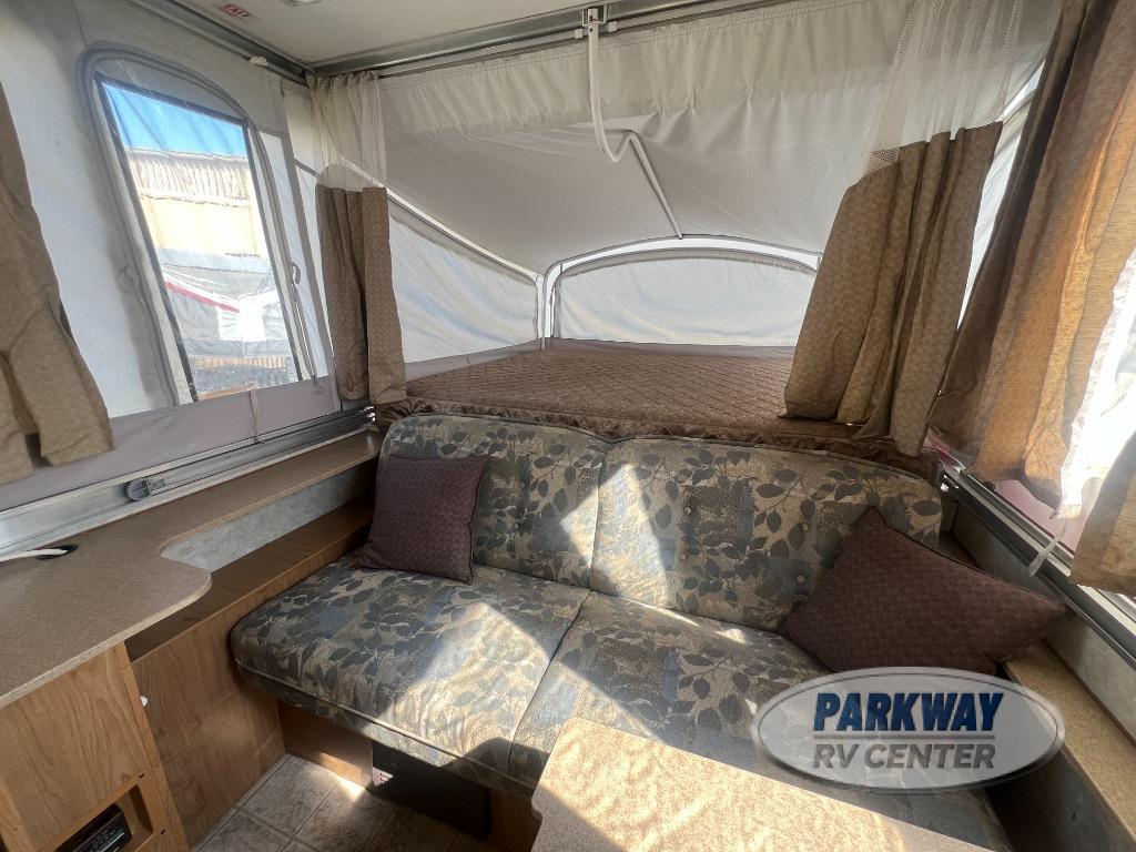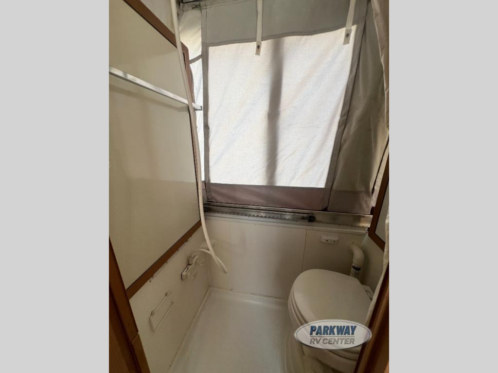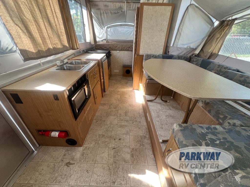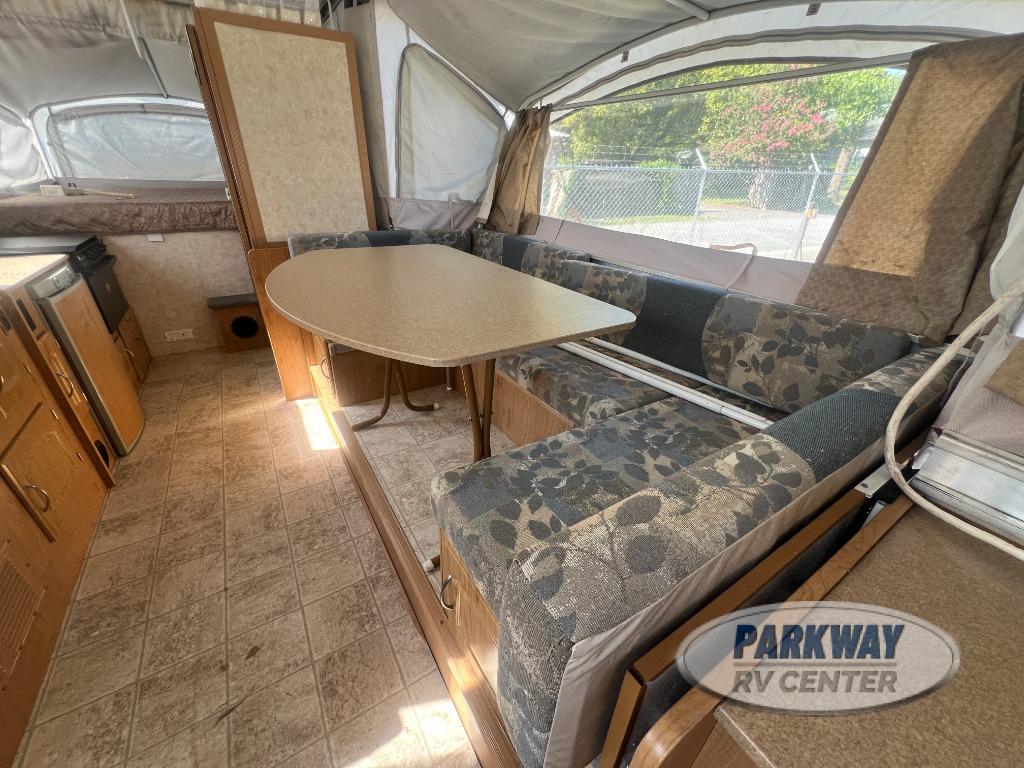 Two King Tent End Beds, Solid Walled Bathroom w/Shower & Flushable Commode, Slideout Portable Dinette Table, Sofa Bed, Flip-Up Table, Double Kitchen Sink, 3 Burner Range, Outdoor RVQ Grill and More.