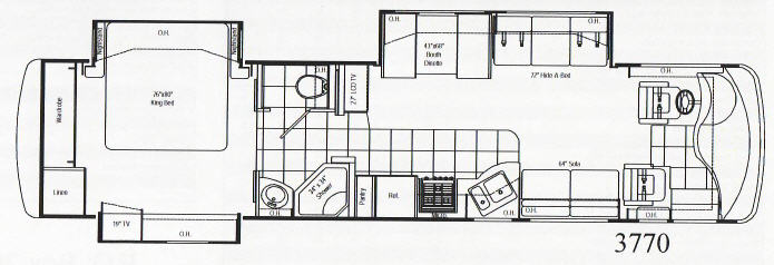 Triple Slide Motor Home w/Rear Bedroom, Slide Out King Bed, Linen, Wardrobe, 19'' TV, Private Toilet Area, Lavatory, Corner Shower, Kitchen Sink, Pantry, Refrigerator or Opt. Side-by-Side Refrig., 3 Burner Range, Double Kitchen Sink, Sofa, Slide Out Booth Dinette or Opt. Buffet/Hide-a-Bed, and More.