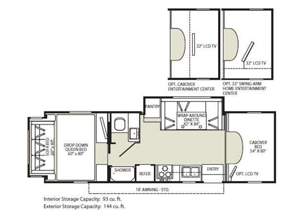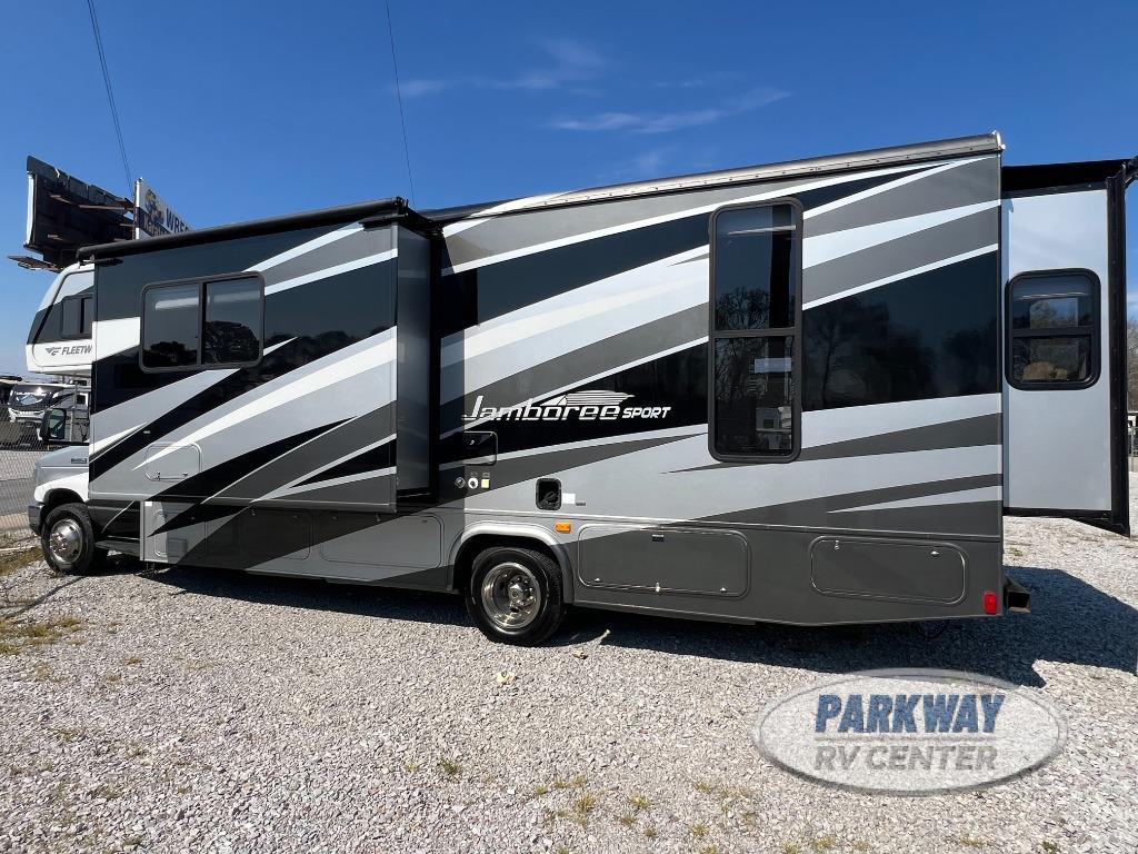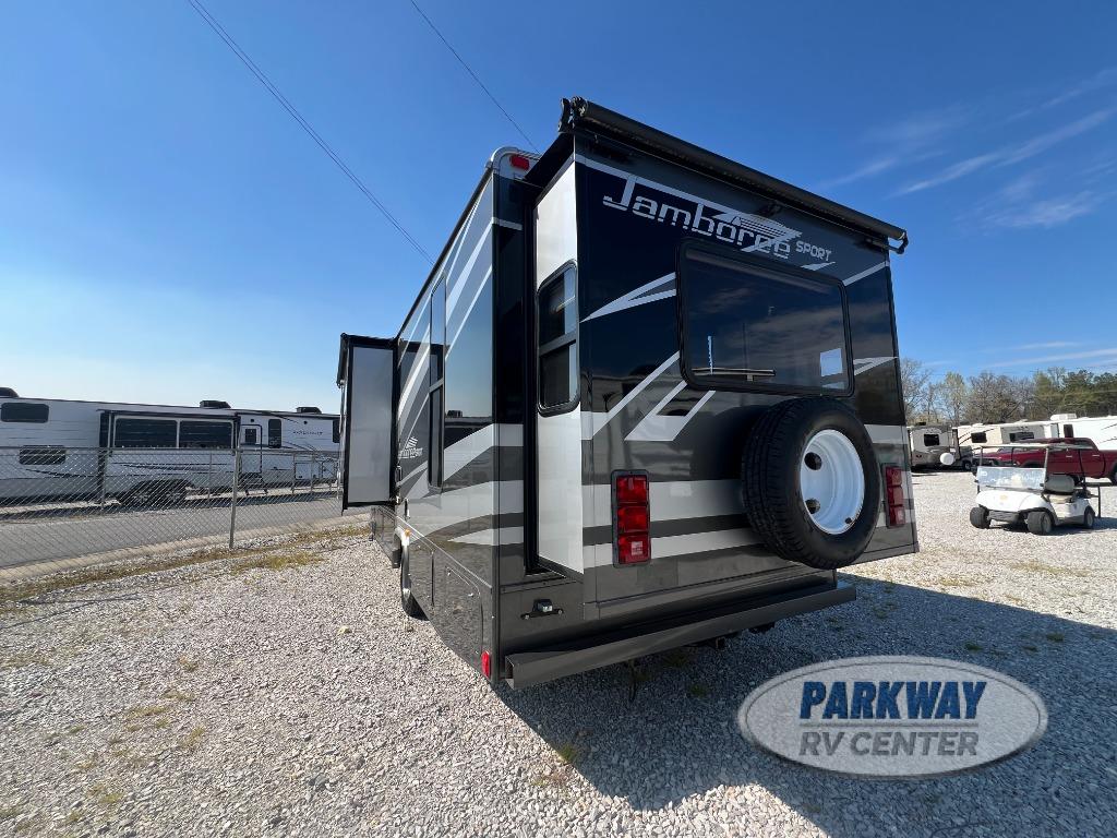 Single Slide Jamboree Sport Motor Home Class C, Rear Sofa Bed, Drop Down Queen Bed, Private Toilet Area w/Lav., Pantry/Wrap Around Dinette, Cabover Bed, Double Kitchen Sink, 3-Burner Range, Microwave, Refrigerator, Shower, Overhead Cabinets Throughout, 18' Awning & Much More. Available Options May Include: LCD TV in Cab, Cabover Ent. Center w/ 32" LCD TV, Swing-Arm Home Ent. Center w/32" LCD TV.