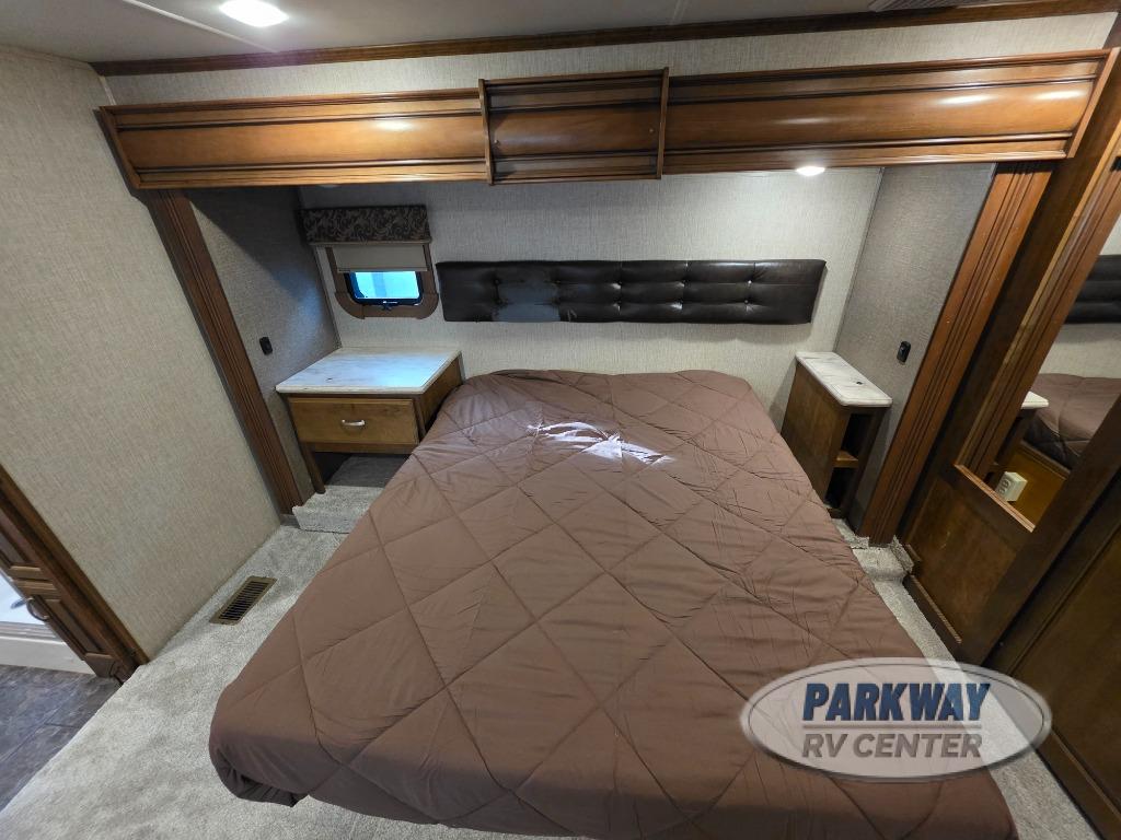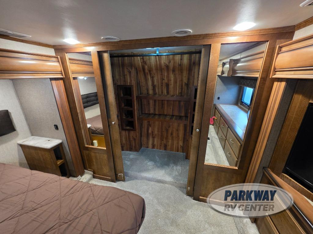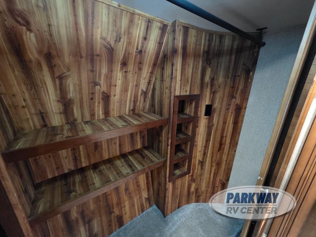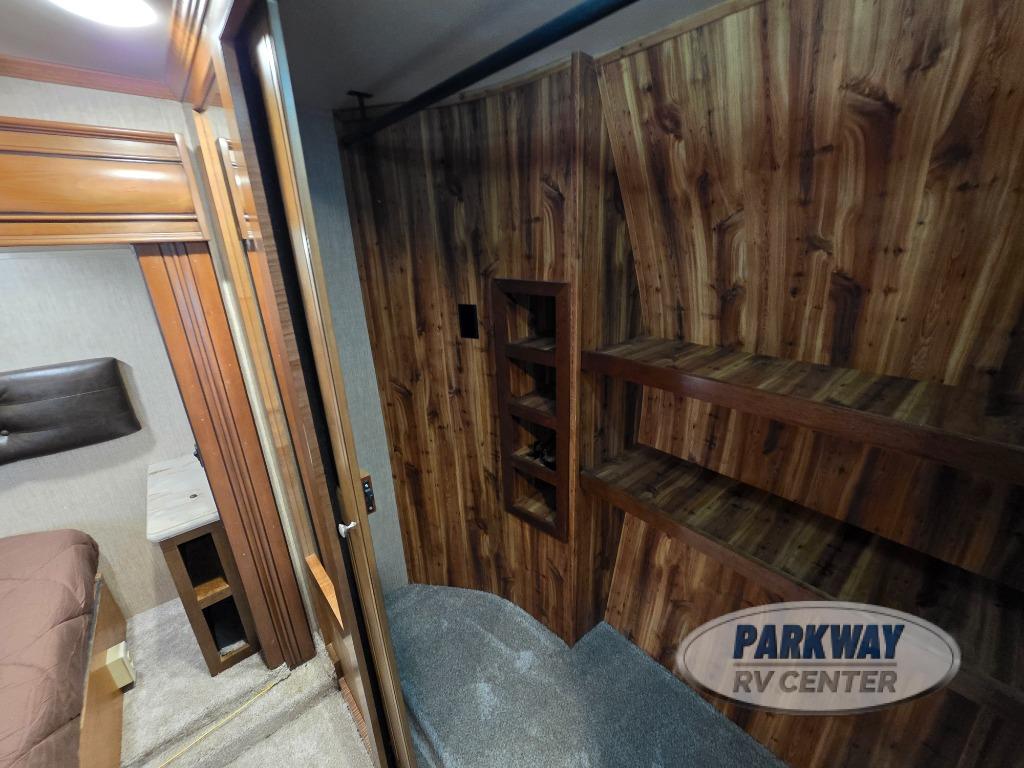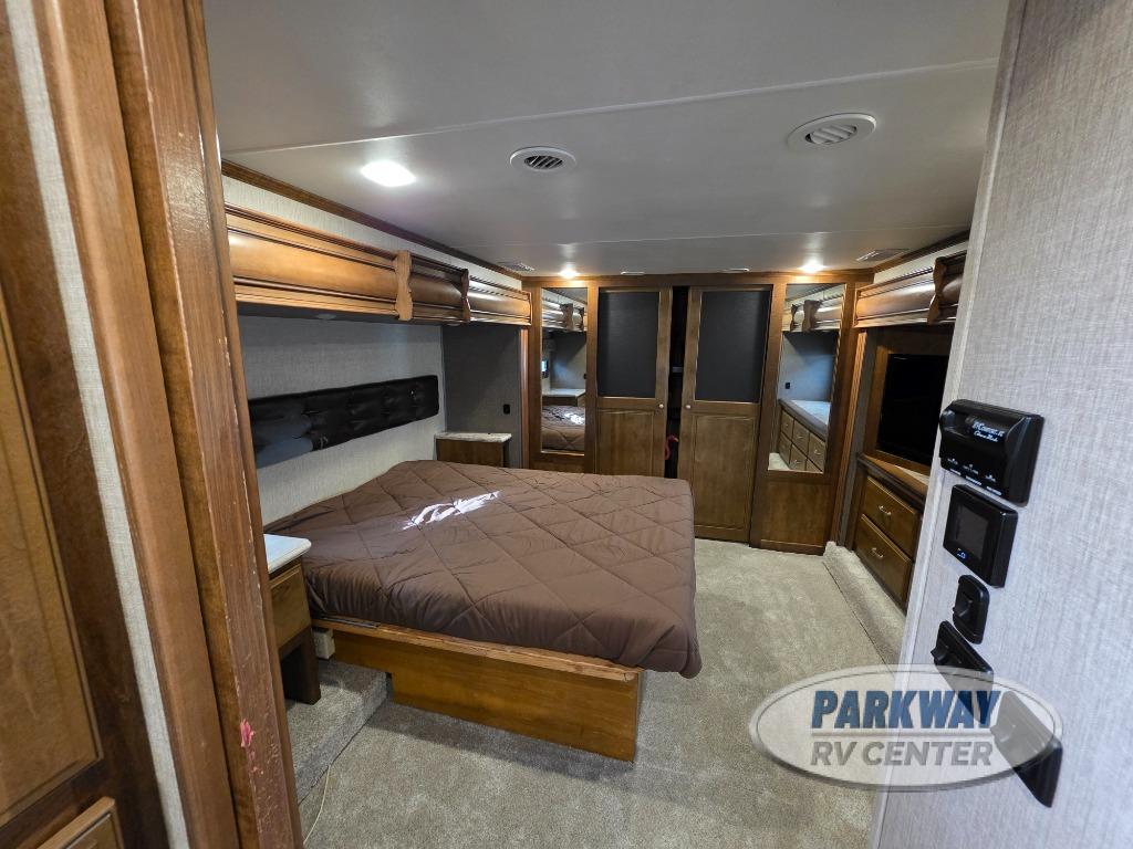 In the front bedroom you will see that there is a slide with a closet and a queen bed, or choose an optional king. Across from the bed there is a slide with a TV and overhead cabinets. Along the front wall of the room you will find that the wardrobe offers extra storage, plus so much more!