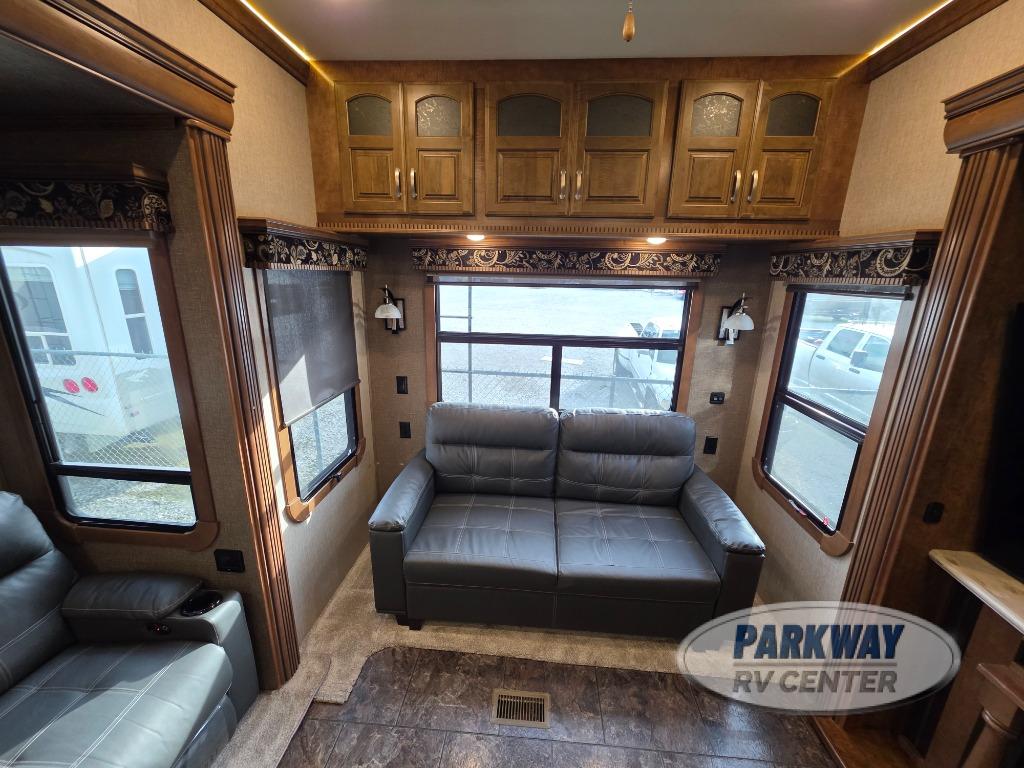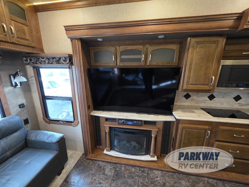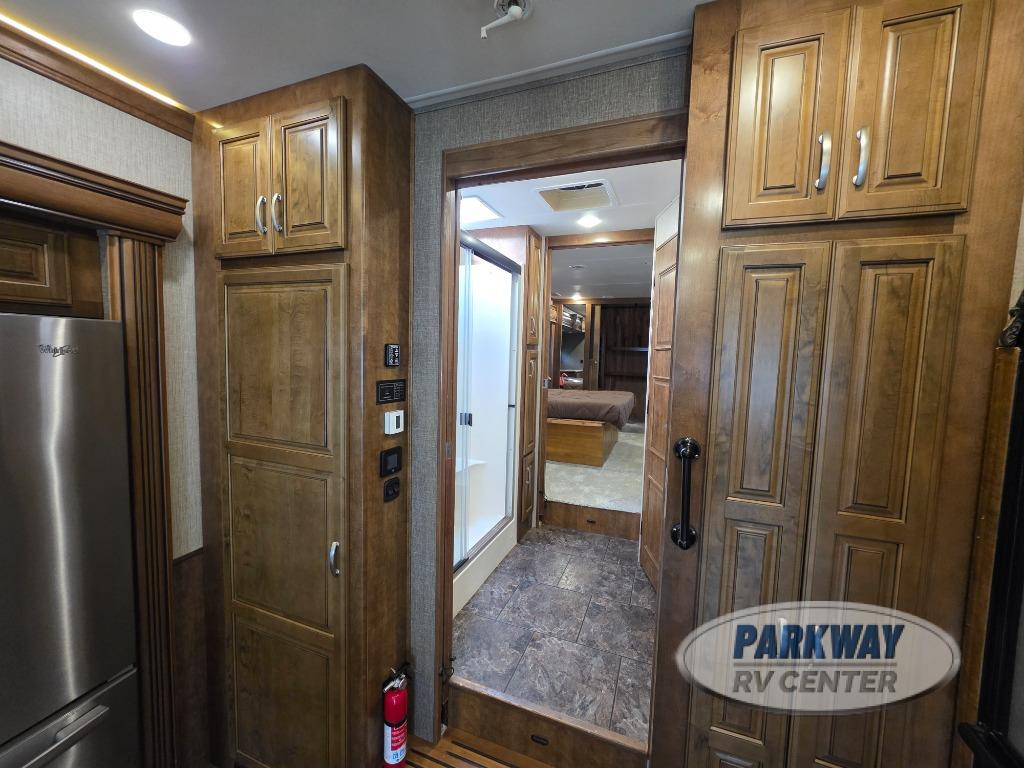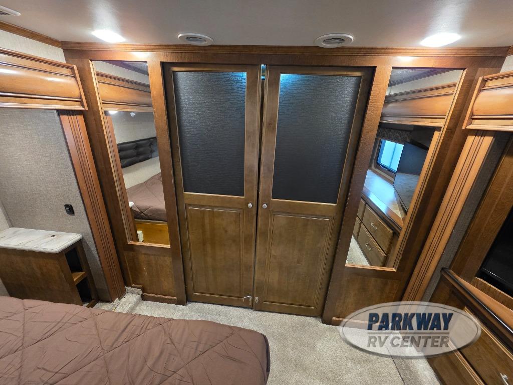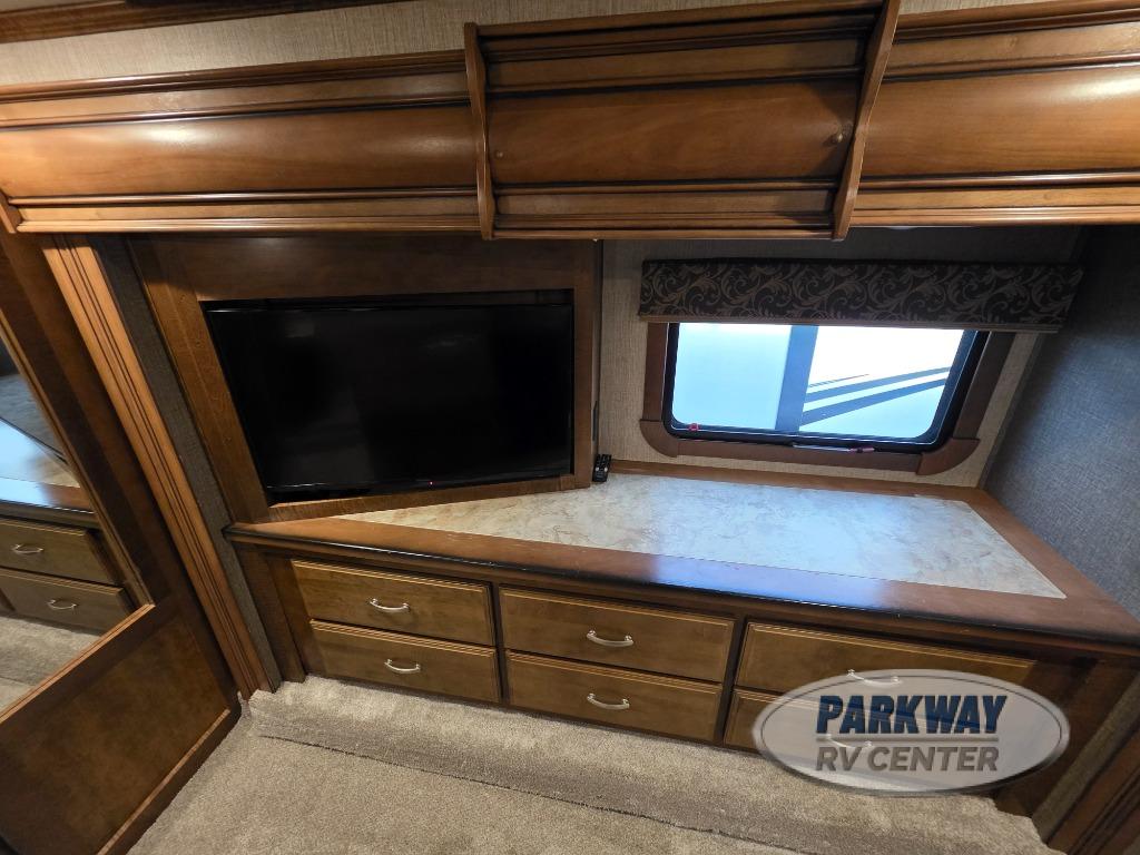 In the front bedroom you will see that there is a slide with a closet and a queen bed, or choose an optional king. Across from the bed there is a slide with a TV and overhead cabinets. Along the front wall of the room you will find that the wardrobe offers extra storage, plus so much more!
