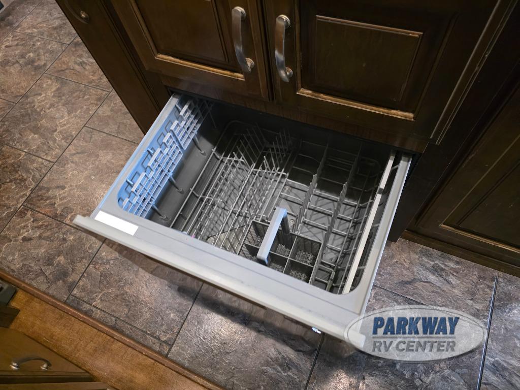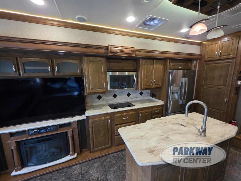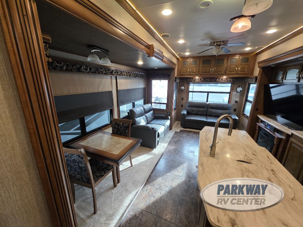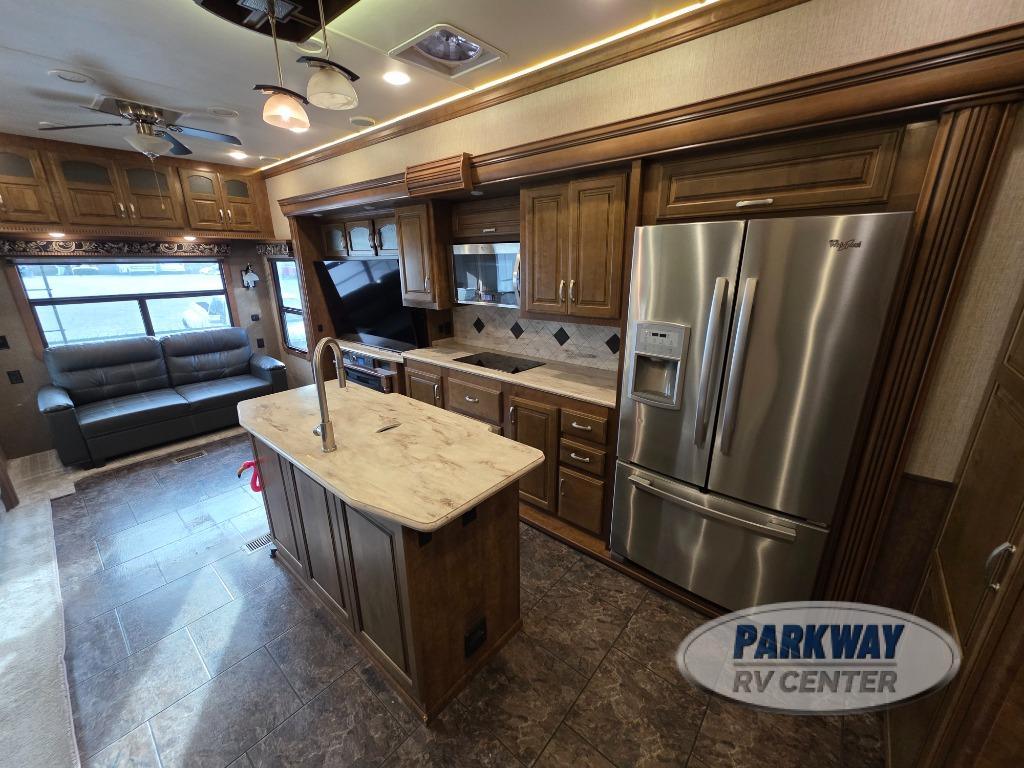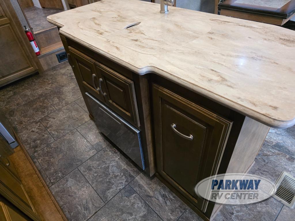 To the left of the entrance there is a slide with a free-standing dinette and theater seating. On the opposite side of the trailer you will find a slide with an entertainment center, pantry, three burner range, microwave, and refrigerator. Along the rear wall you will find a sofa. The kitchen also has a kitchen island which has extra counter space and a large kitchen sink.