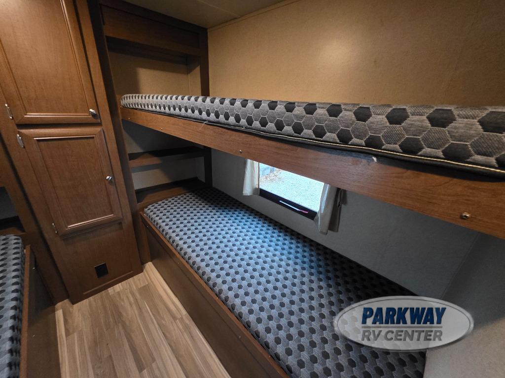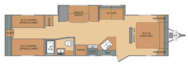 The rear bunk house is ideal for your kids. There are two sets of bunk beds. One set is 28" x 74" while the other set is slightly wider at 38" x 74". Between the bunks and along the rear wall you will find extra storage with a center closet, plus so much more.