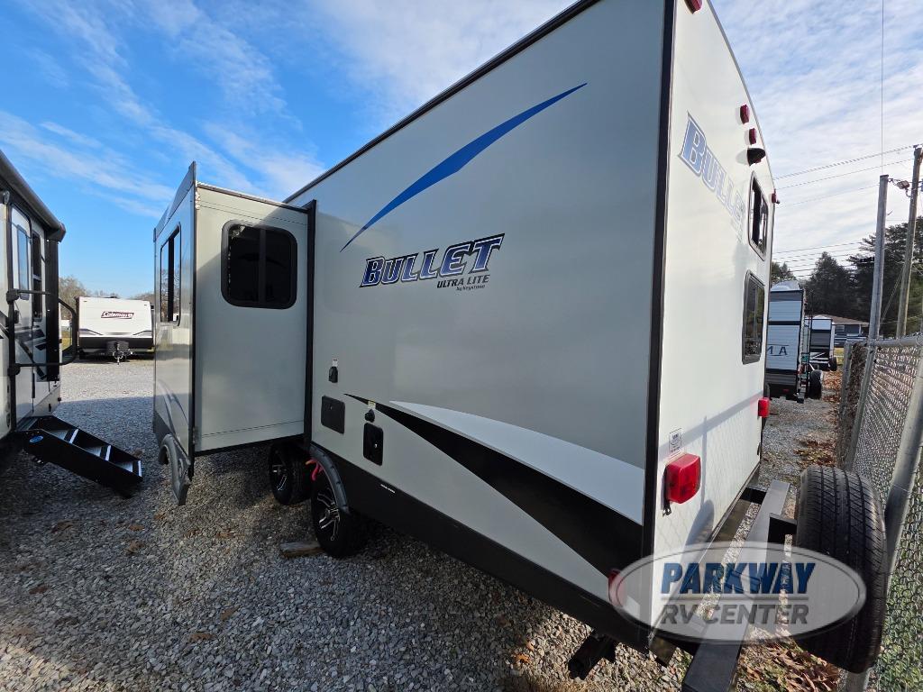 Load up your family and set out to your favorite campground with this single-slide Bullet travel trailer. You will enjoy the comfort and seclusion that the private bedroom brings, and your children will happily choose the double-size bunks for both play time and nap time. More sleeping space can be created by simply changing over the U-shaped dinette from a cozy dining area into a relaxing bed giving this trailer the ability to sleep eight people each night. Not only will you find enough tools indoors to create a perfectly home-cooked dinner while on the road, but you will also find room outside with the outdoor kitchen to whip up meals when you want to spend your evenings cooking in the fresh air.