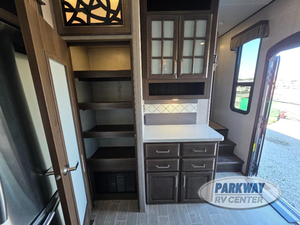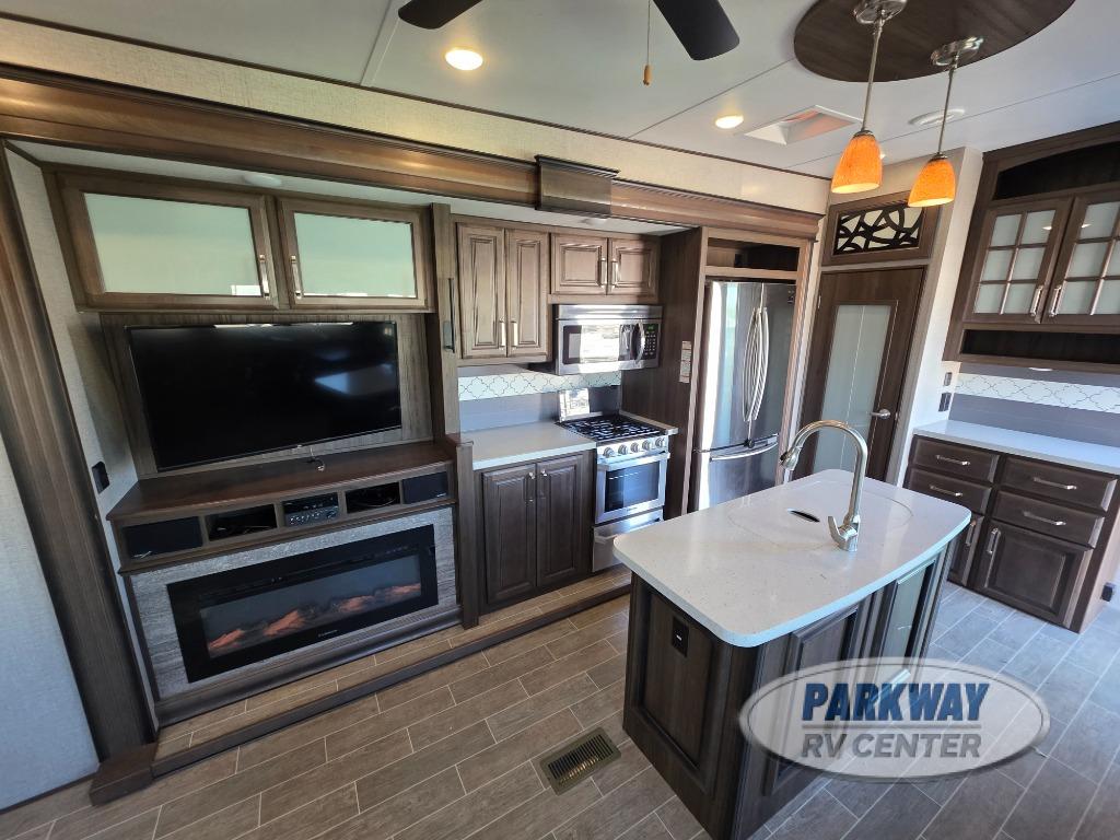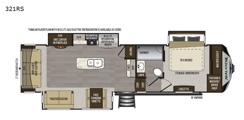 The perfect RV for entertaining and relaxing is this Keystone Avalanche fifth wheel. The combined living and kitchen area includes dual opposing slides for more floor space as you work around the kitchen island and more seating accommodations as you gather together each night on the sofa sleeper, the theater seating featuring heat and massage, or the free-standing table with chairs. This unit also offers a fully loaded kitchen with an 18 cubic foot residential refrigerator, a three-burner range top, a large pantry, and a curio cabinet.