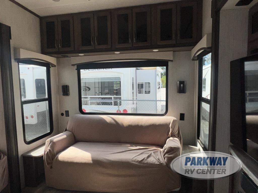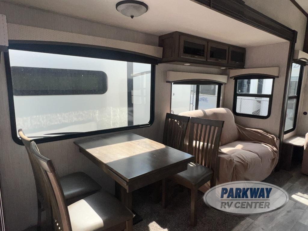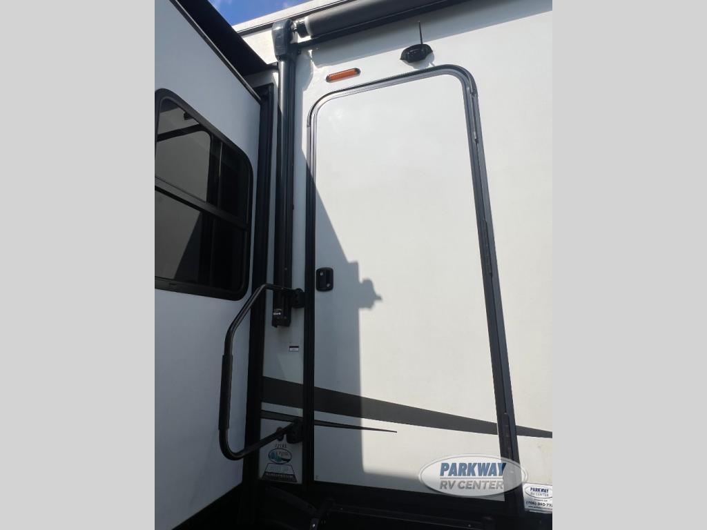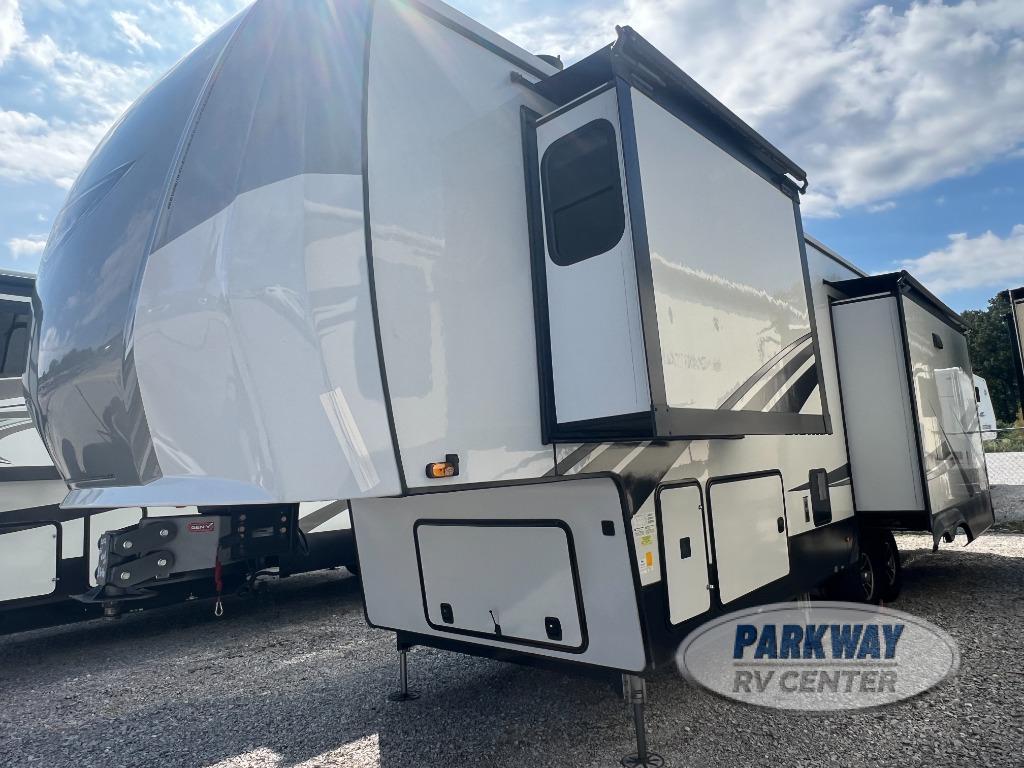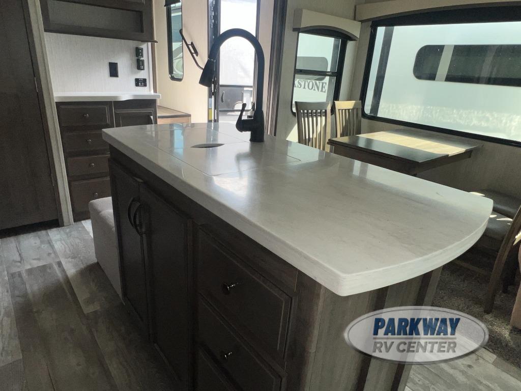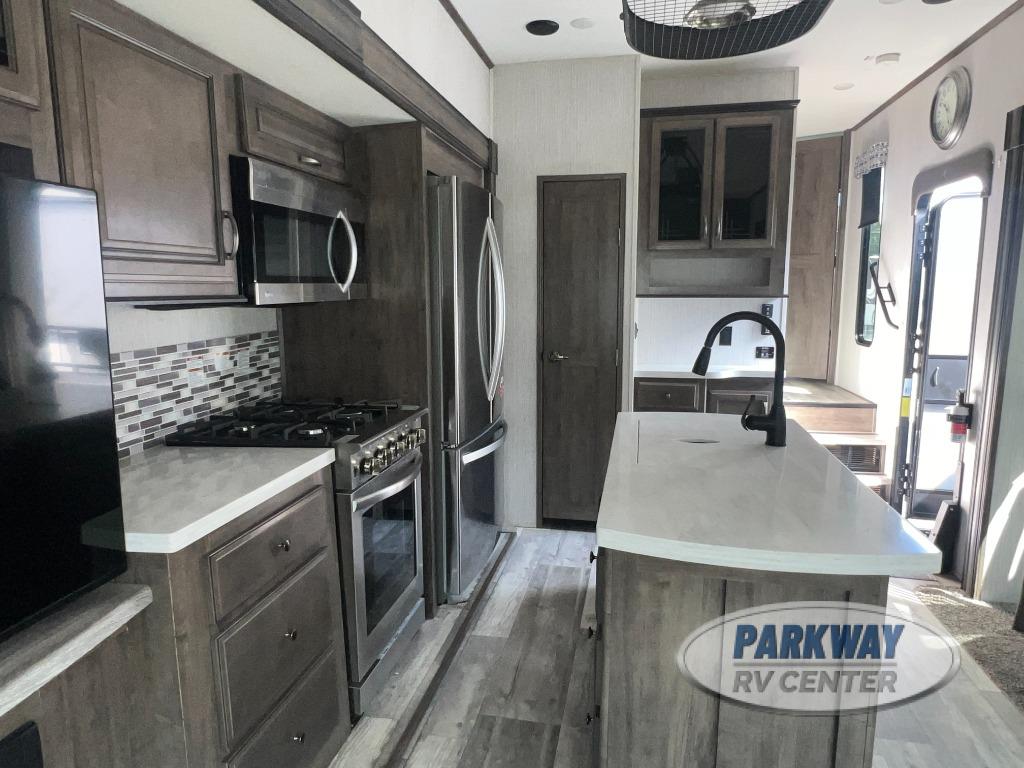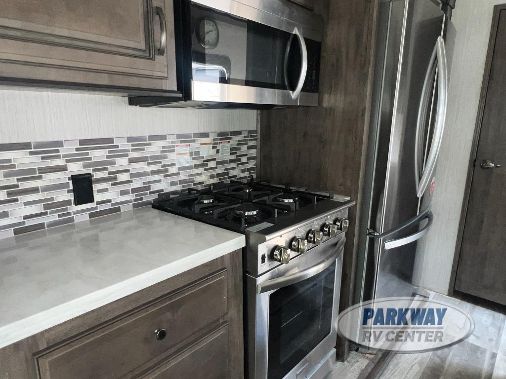 Any couple would love having this fifth wheel at the campsite with triple slides offering a spacious interior, extra sleeping space on the furniture for any overnight guests, and all the storage inside and outside for those longer trips. The cook will enjoy preparing and serving meals on the oversized kitchen island with solid surface counter space and a sink to keep everything clean. The residential refrigerator and the floor to ceiling pantry can hold all of the cold ingredients, paper goods, and snacks necessary to keep everyone fed. The free standing table with four chairs offers a great place to dine and work, and the theater seats along with the rear tri-fold hide-a-bed sofa offer a place to visit and enjoy the 50" LED HDTV with cozy fireplace below. And the drop down pass-through storage, the 16' electric awning and the bumper mount swivel gas grill give you more living, storage and cooking space.