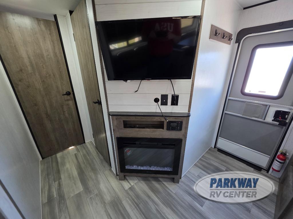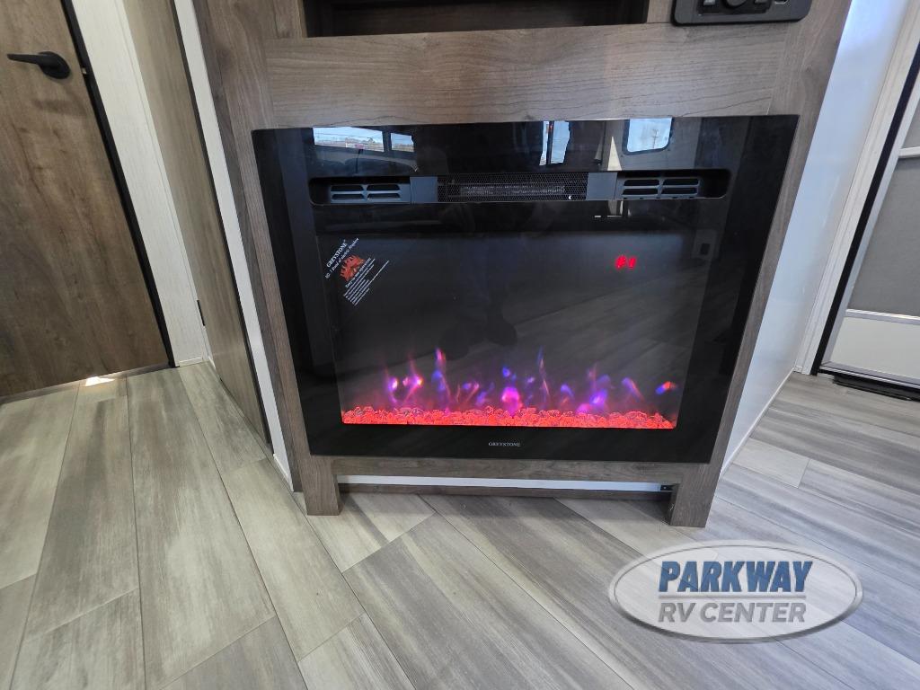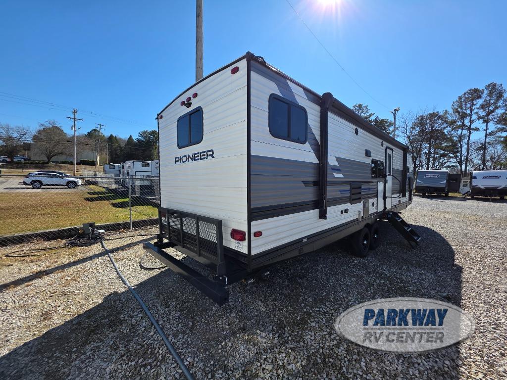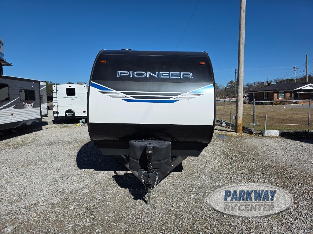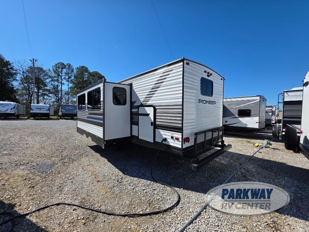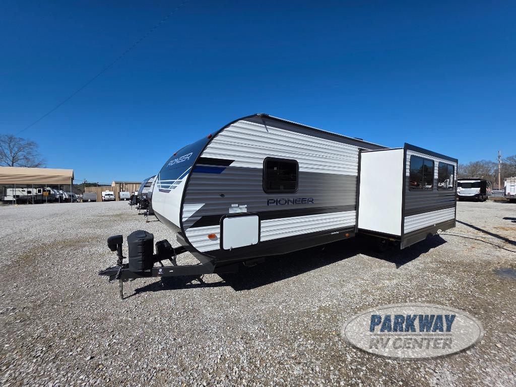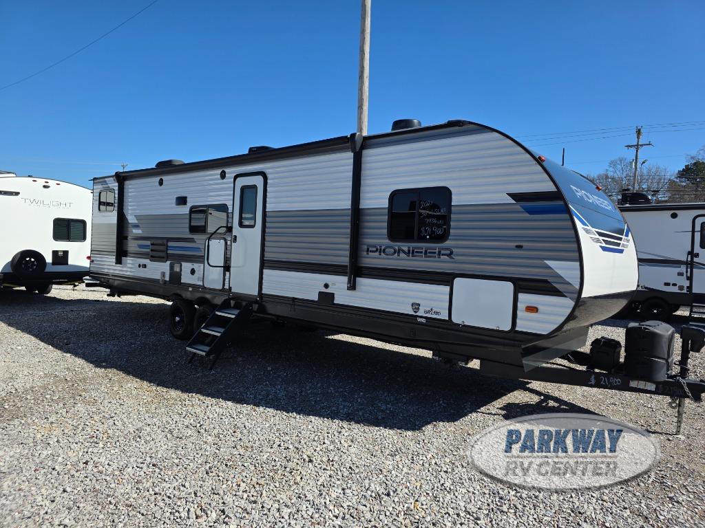 Your search is over! This Pioneer has paved the way for the ultimate setup for a larger family or group of friends with its rear private bunkhouse with a space saving sliding door, a sofa base that converts into a 60" x 70" bed below two upper flip down bunks. There is also a handy exterior storage door that allows you to stow items inside for your travels. You will have your own privacy in the front bedroom and your own queen bed and clothing storage. There is a full bathroom to keep everyone clean, and the full kitchen amenities will allow everyone to stay fed. There is an L-shaped counter, a double door refrigerator and a pantry. The large slide includes a U-shaped dinette and sofa for more floor space and easy viewing of the fireplace. And don't forget about the 20' power awning for protection from the elements, and the outside kitchen with griddle.