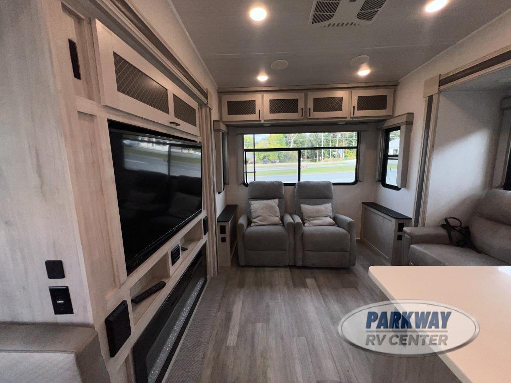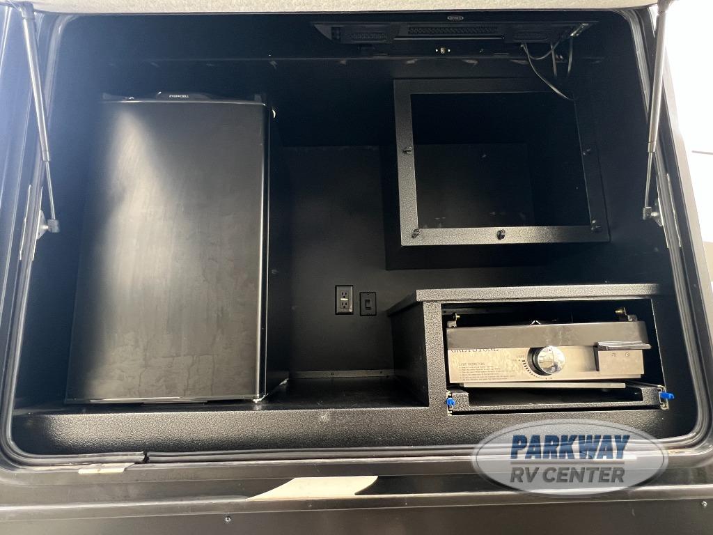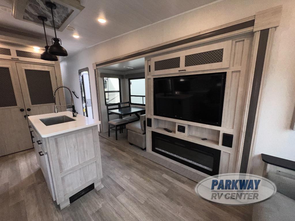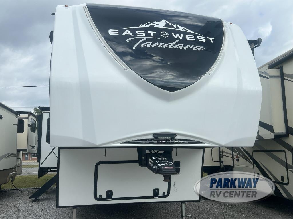 There is so much to fall in love with on this Tandara fifth wheel! From the front master suite with a full-width wardrobe and king bed slide to the spacious living area with opposing slides, theater seating, and a hide-a-bed sofa, there is quite a lot of comfort and convenience.