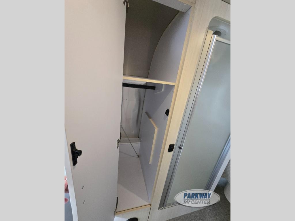 When you enjoy the finer things when traveling, this trailer will provide that for you plus lots of natural lighting and plenty of conveniences. The convertible rear dinette offers a place to dine and socialize for four, and there is a lounging area along the side with a TV on the wall. The table acts as a sturdy base below the cushions when you need some sleeping space. The front bedroom offers more panoramic windows and a comfortable queen bed with a view each morning and night. You will find storage for your clothing, and a split bathroom with a private toilet and sink on one side and a shower that stands independently across the hall. And the kitchen offers everything you need to make meals including extra counter space and a refrigerator for leftovers.