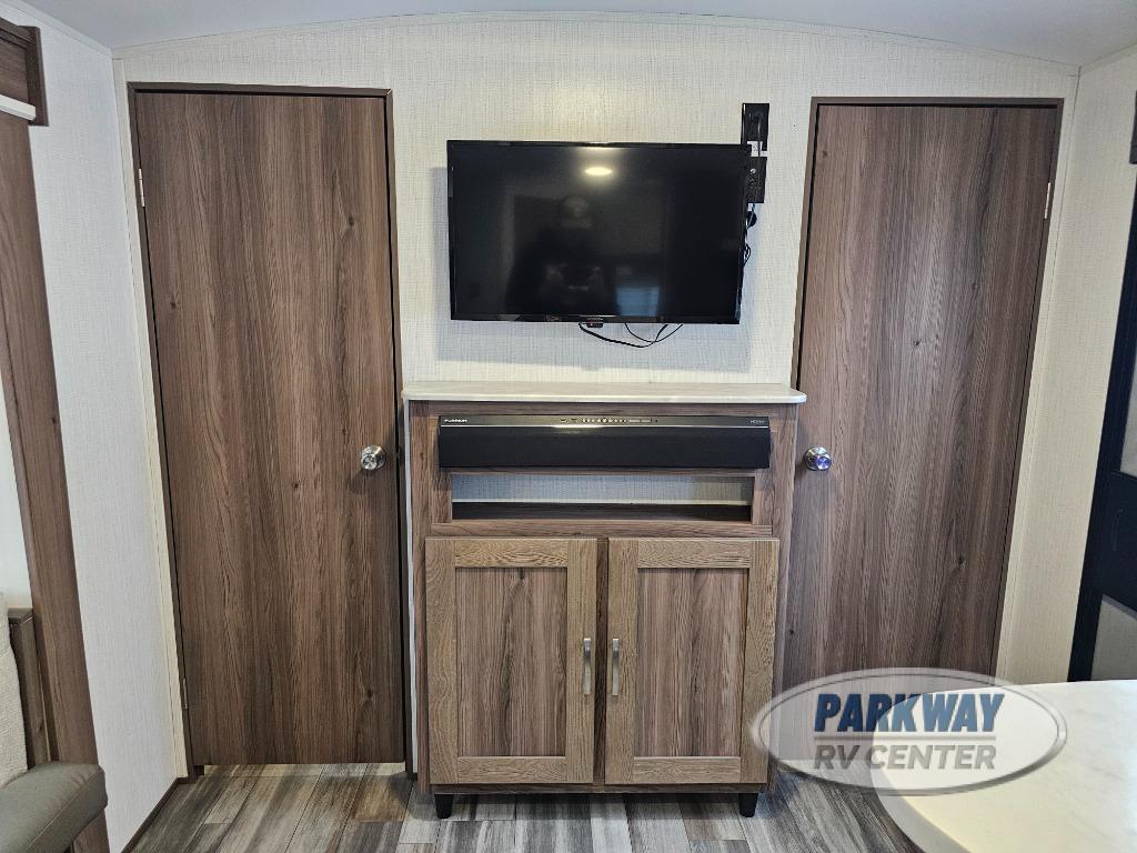Double bed bunks, an outside kitchen, one large slide for added roominess, and a private front bedroom makes this a great choice for your larger family. The rear corner bathroom offers privacy and is located near the bunks for quick access at night for little ones. The opposite rear corner features double bed bunks so let everyone bring along a friend since you can also convert the u-shaped dinette for added sleeping within the slide. A full chef kitchen inside, and an outside kitchen offers you options when it comes to cooking and dining. You will love the air fryer oven, solid surface countertops, and 10 cu. ft. stainless steel refrigerator. When you're ready to wind down your nights, head to the front private bedroom with dual entry doors, one on either side of the entertainment center, for a good night's rest on a king-size sliding bed with a true Serta Comfort mattress!