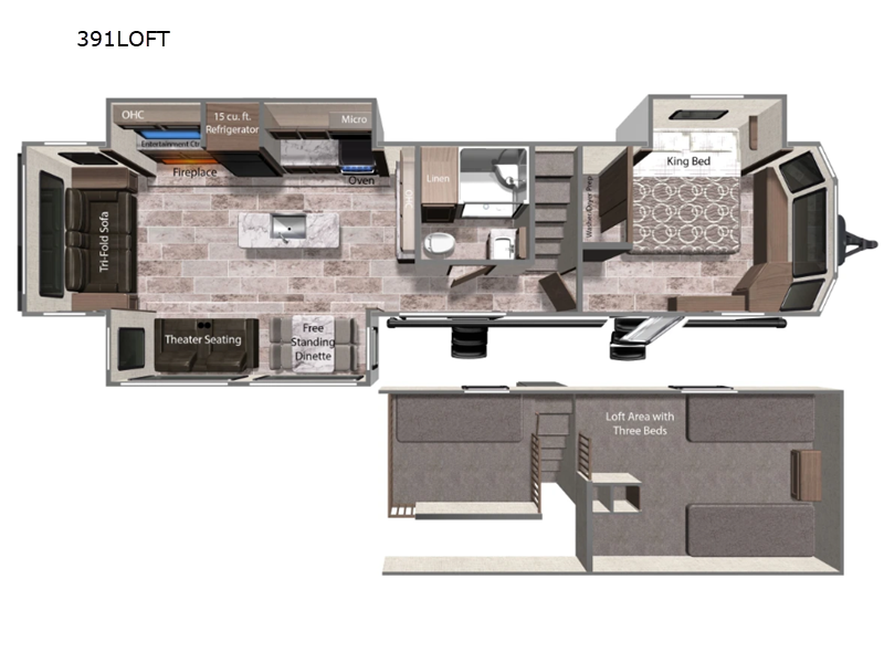 Head off to your favorite locations in this destination trailer that can sleep seven people each night. Whether you're relaxing in the rear living room, dining at the free-standing dinette, or prepping dinner at the kitchen island, you're sure to love every minute in this trailer. There is also an entertainment center with an HD LED TV for movie nights and a fireplace to make your space feel more like home. A full bath, complete with a large linen closet and shower with a seat will let you freshen up before bed, and the loft area with three beds will be perfect for kids, guests, or storage space! You'll find the front private bedroom to be ultra accommodating with its king bed slide out, wrap-around counter space, plus washer and dyer prep!