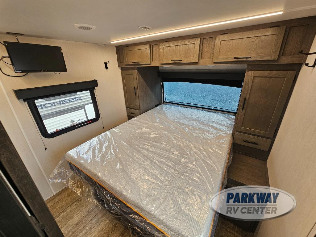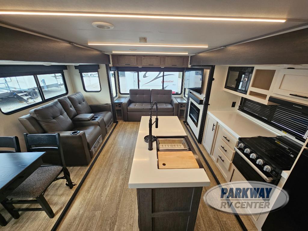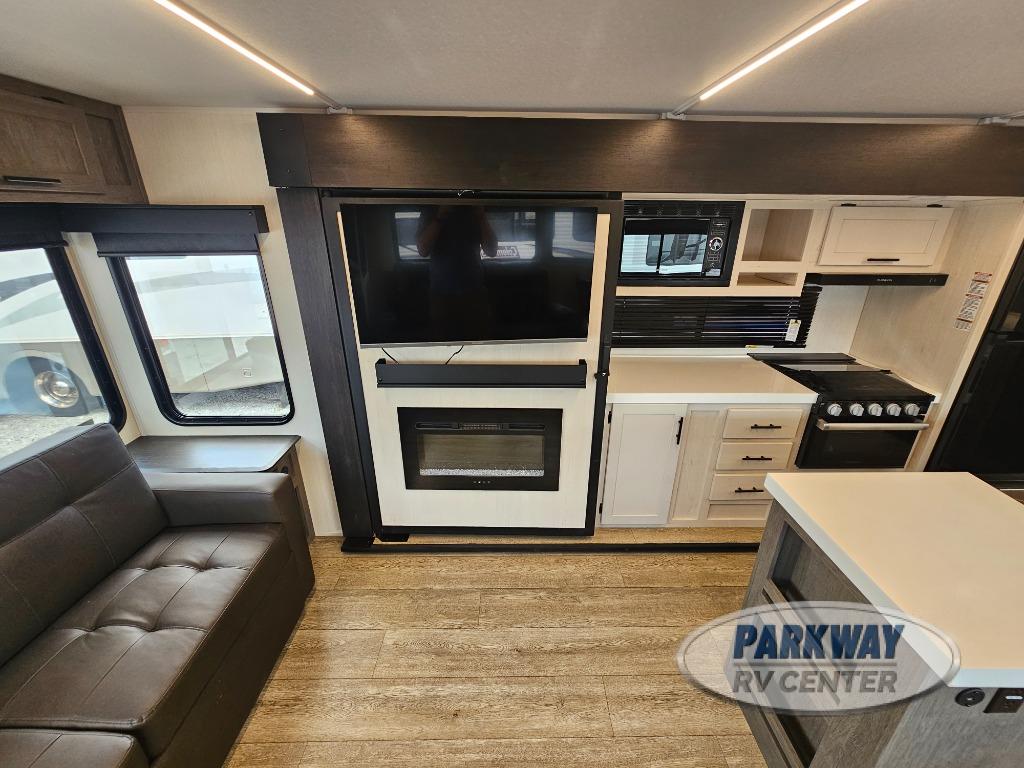 This trailer has it all for maximum comfort and convenience as well as entertainment! The rear living area includes a tri-fold sofa with a rear Pano-Vision window for great views of your campsite, and dual opposing slides widen this area so you can visit with friends. You'll also find theater seating, plus a free-standing table with two chairs and a storage ottoman seat. Enjoy the fireplace on a cool night or when you want a little ambiance while seated inside. Two patio awnings will provide an outdoor living area; just grab your camping chairs from the full pass-through storage. When you want to call it a night, fall quickly to sleep on the queen bed in the front bedroom with easy access to a dual entry bathroom!