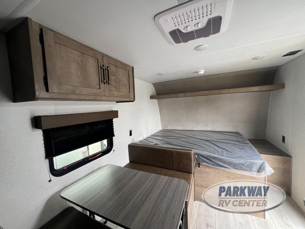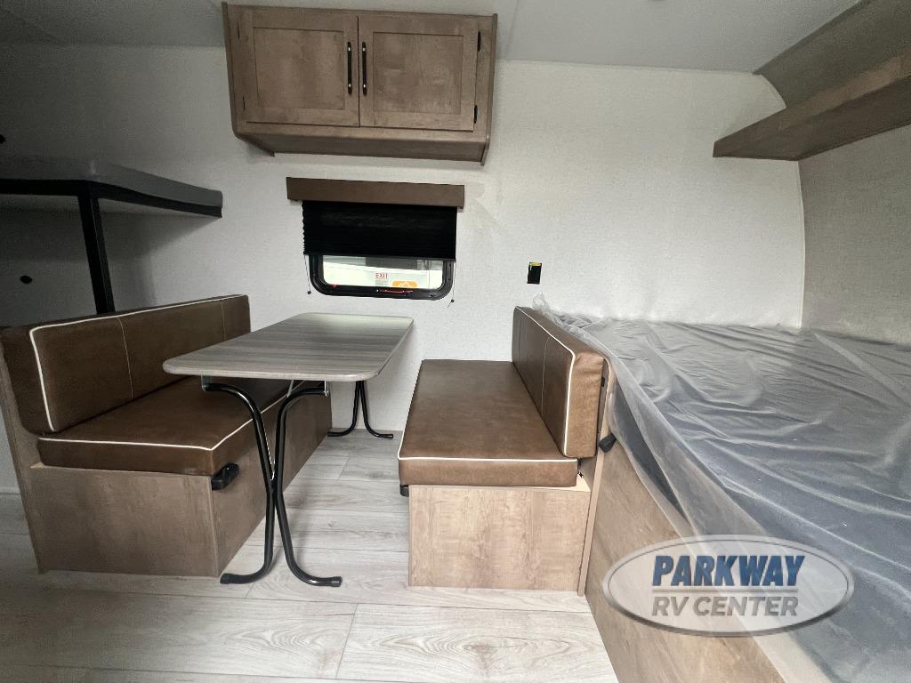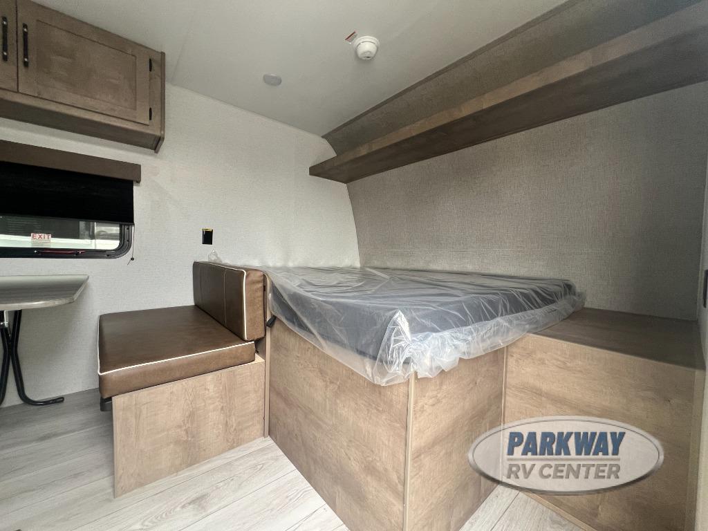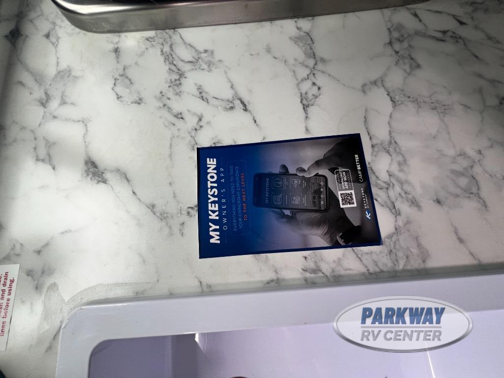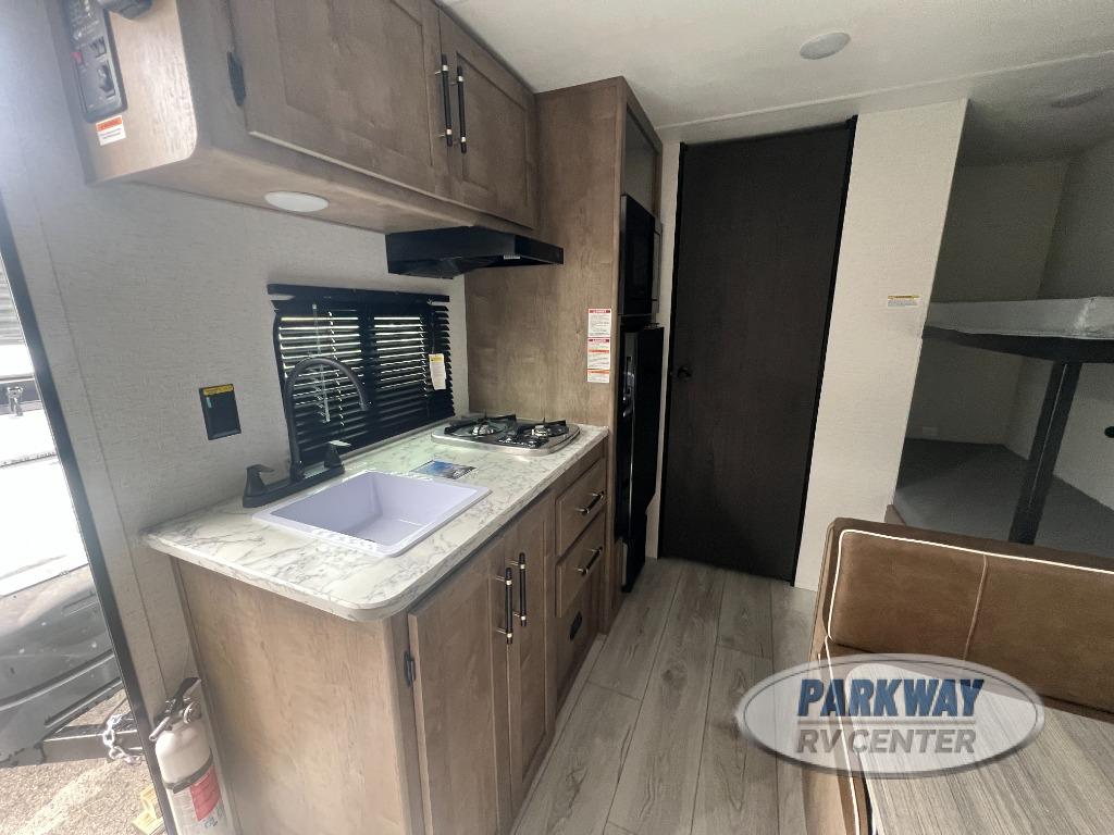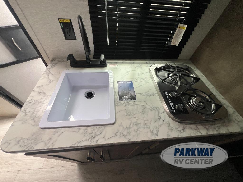 Get ready for outdoor fun with your favorite people when you have this trailer in tow! Once at your campsite, you can easily setup the 10' power awning, grab your camping chairs from the pass-thru storage, and relax or start playing. The cook will love the galley kitchen with the two burner cooktop, plus a refrigerator for cold items. If you like, you can eat inside at the booth dinette which doubles as sleeping space, and of course the kids will love the bunk beds next to the full bathroom. And you will sleep soundly on the front queen bed.